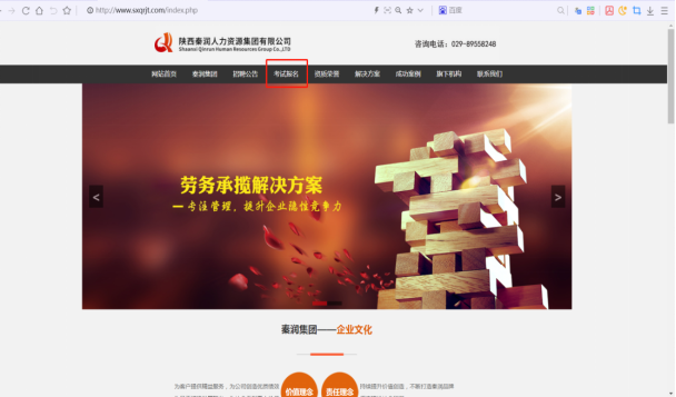 1.登錄陜西秦潤人力資源集團有限公司官網(wǎng)(網(wǎng)址:http://m.hongbanxa.com/),點擊“考試報名”。